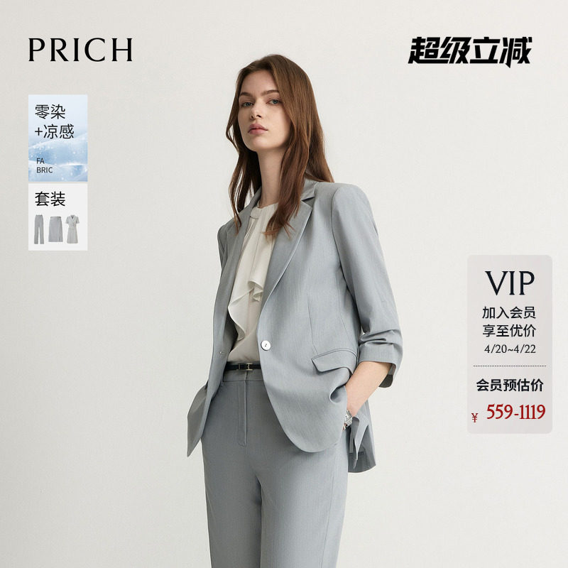 【零染+凉感】PRICH简约堆褶七分袖西装2026夏新款收腰通勤外套女