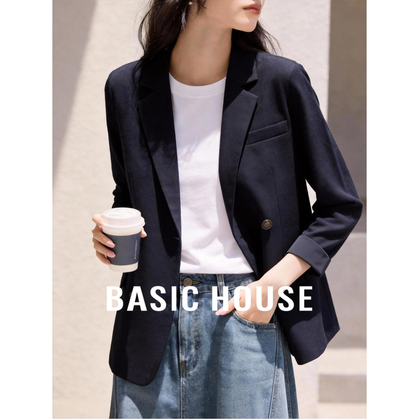Basic House/百家好藏青色双排扣西装女春季新款高知学院风外套