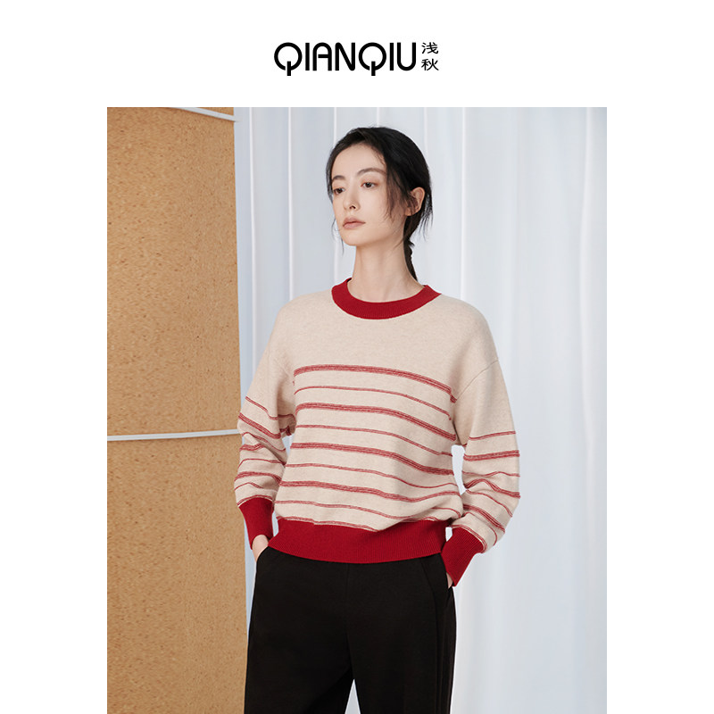 浅秋女士秋冬新款撞色羊毛衫女子条纹圆领针织衫宽松长袖上衣套头