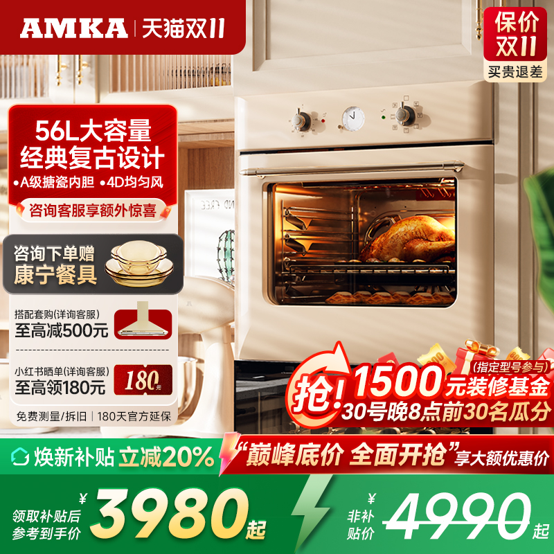 Amka嵌入式电烤箱家用内嵌式多功能大容量搪瓷烘焙白色复古烤箱