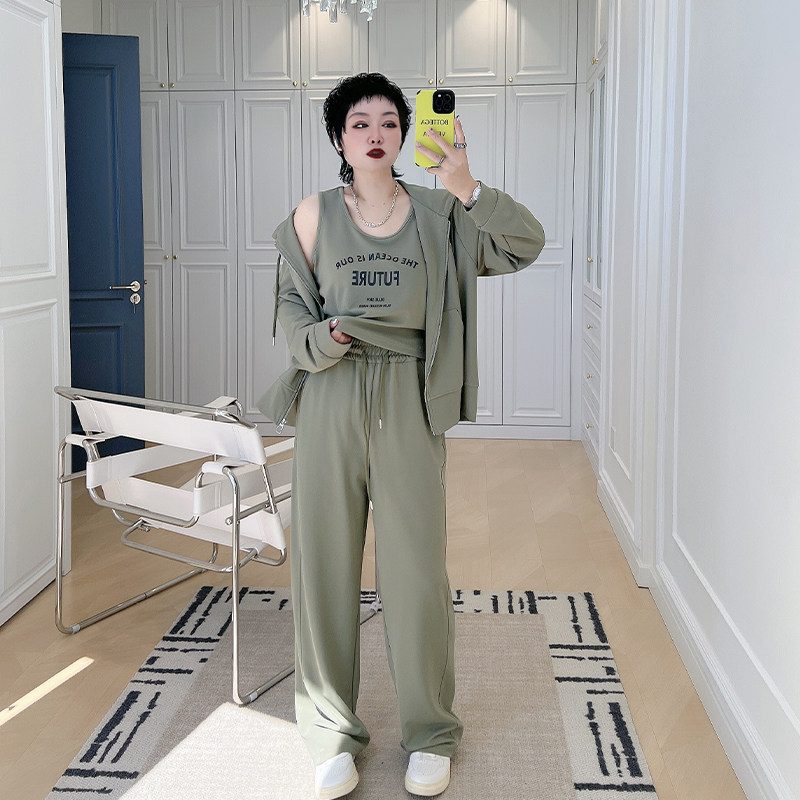 春季休闲运动套装大码女装200斤胖mm时髦卫衣开衫背心裤子三件套