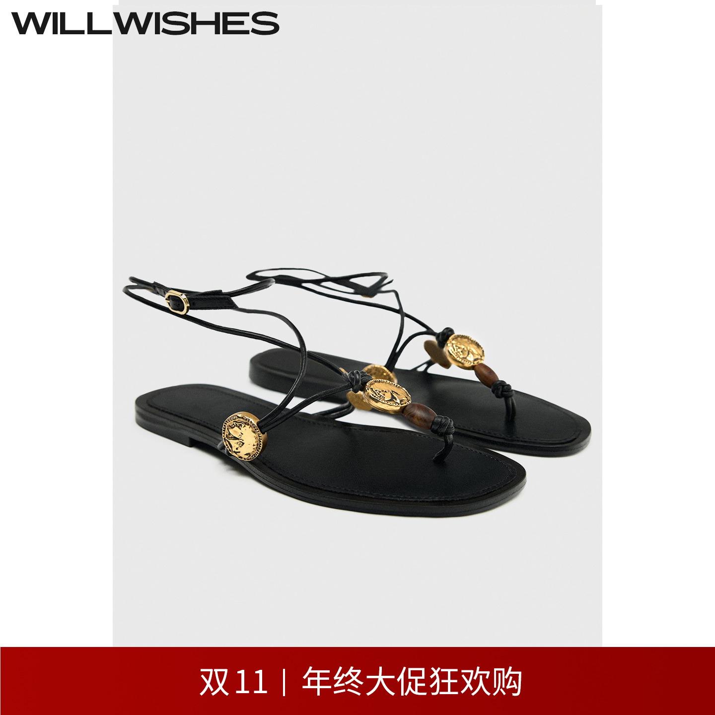 WILLWISHES 王玎设计夏季波西米亚凉鞋女金属亮片平底罗马鞋#449