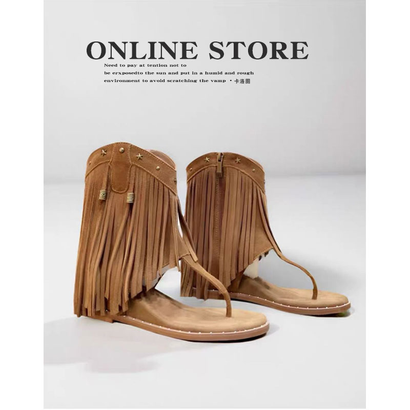 全牛皮罗马夏日真皮铆钉流苏凉靴2025新款坡跟夹趾波西米亚凉鞋女