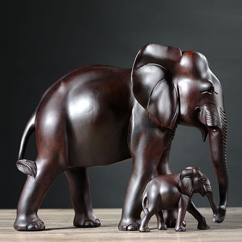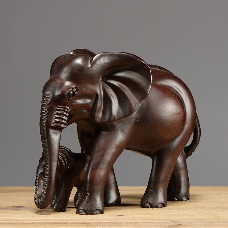 黑檀实木雕刻母子象摆件木头仿古小象吉祥大象家居酒柜红木工艺品