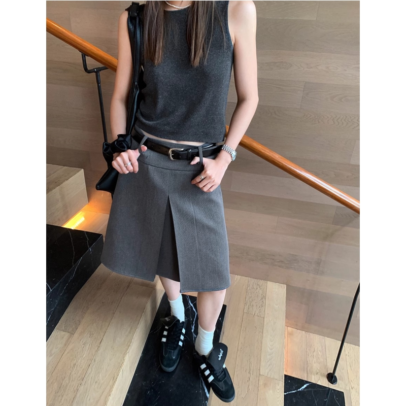 灰色西装半身裙加长版中裙美式复古配腰带A字裙高腰显瘦遮肚短裙