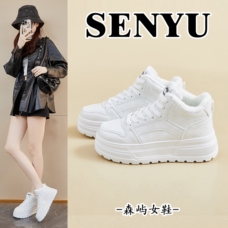 森屿高帮女鞋冬季加绒保暖棉鞋皮面防水防滑厚底运动休闲板鞋百搭