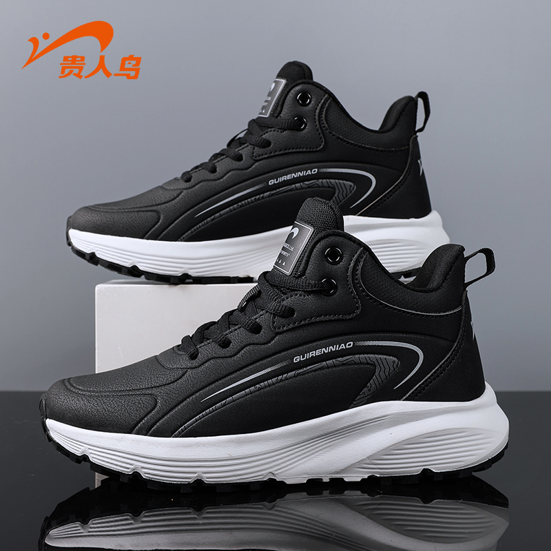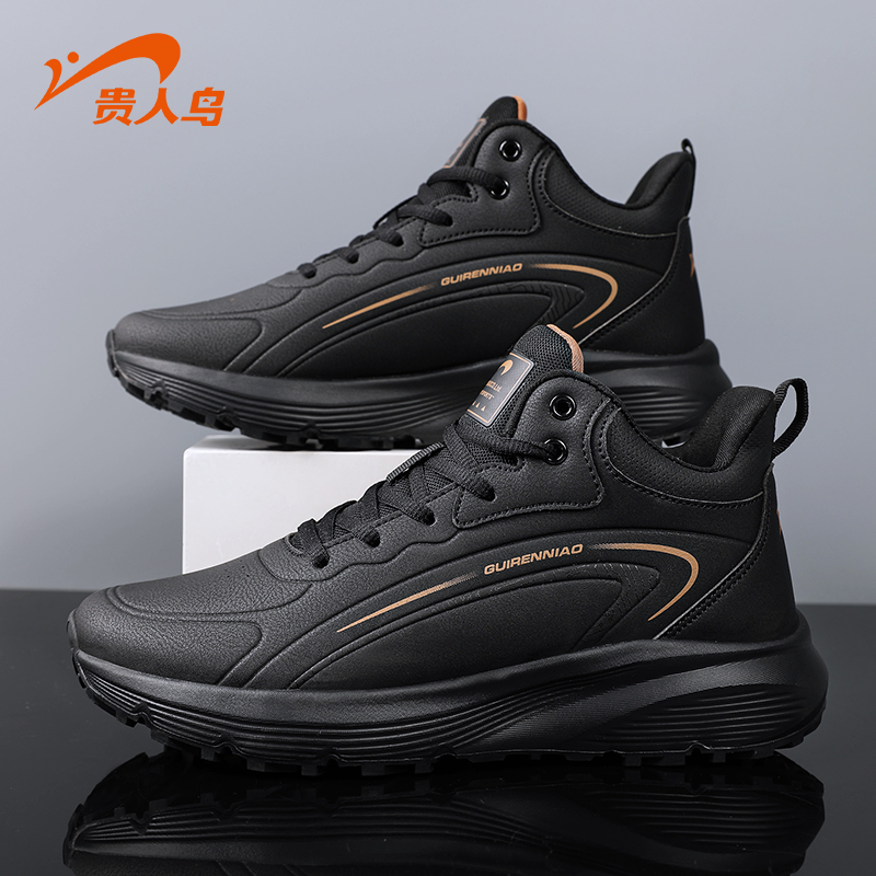 贵人鸟高帮女鞋冬季2025新款情侣款休闲鞋黑色皮面防泼水运动鞋女
