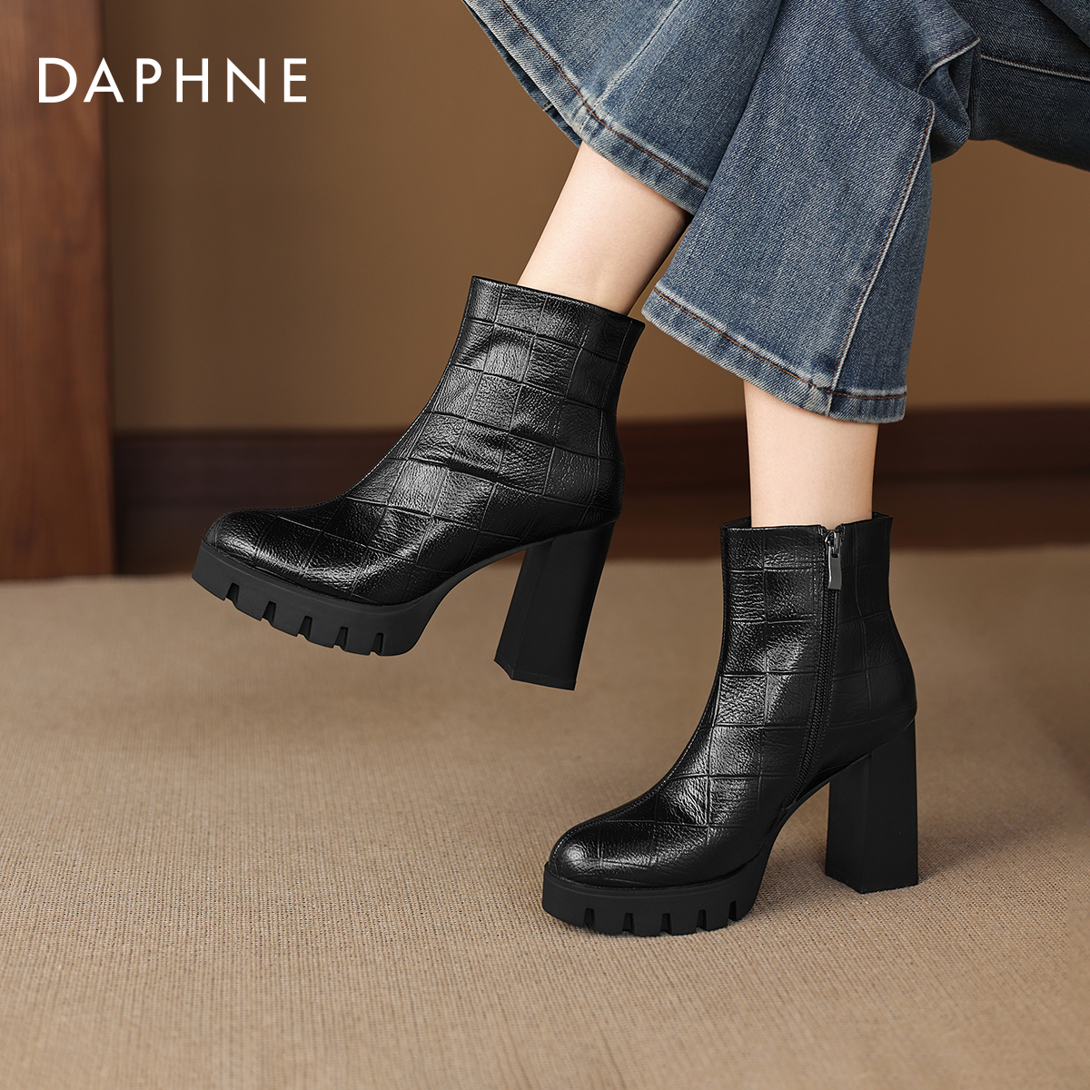 达芙妮高跟短靴女2025新款冬季加绒女鞋厚底马丁靴瘦瘦靴粗跟靴子