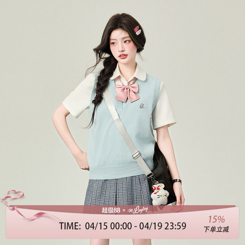 花铃太太哲之道针织马甲夏季毛衣针织短袖蓝色背心女jk制服套装