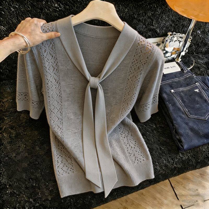 胖MM复古chic洋气系带短袖针织衫女夏季新款超好看爆款显瘦上衣