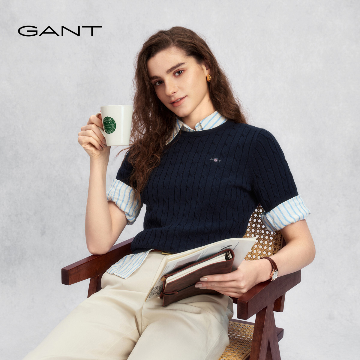 【高智系列】GANT/甘特26春夏女士圆领毛衣老钱风绞花短袖针织衫