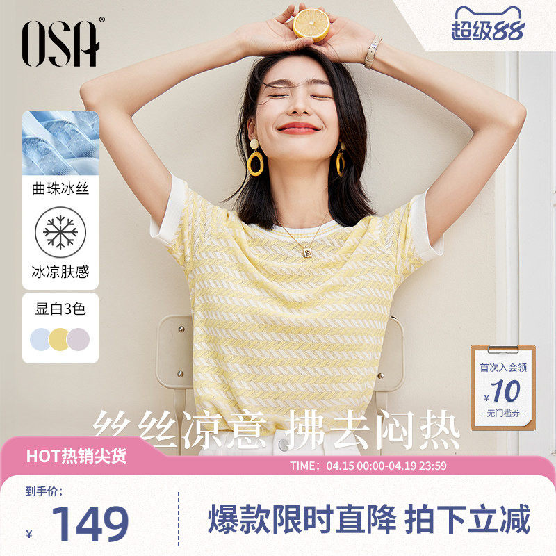 OSA欧莎【凉爽透气】小香风短款轻薄冰丝针织衫条纹短袖上衣女夏
