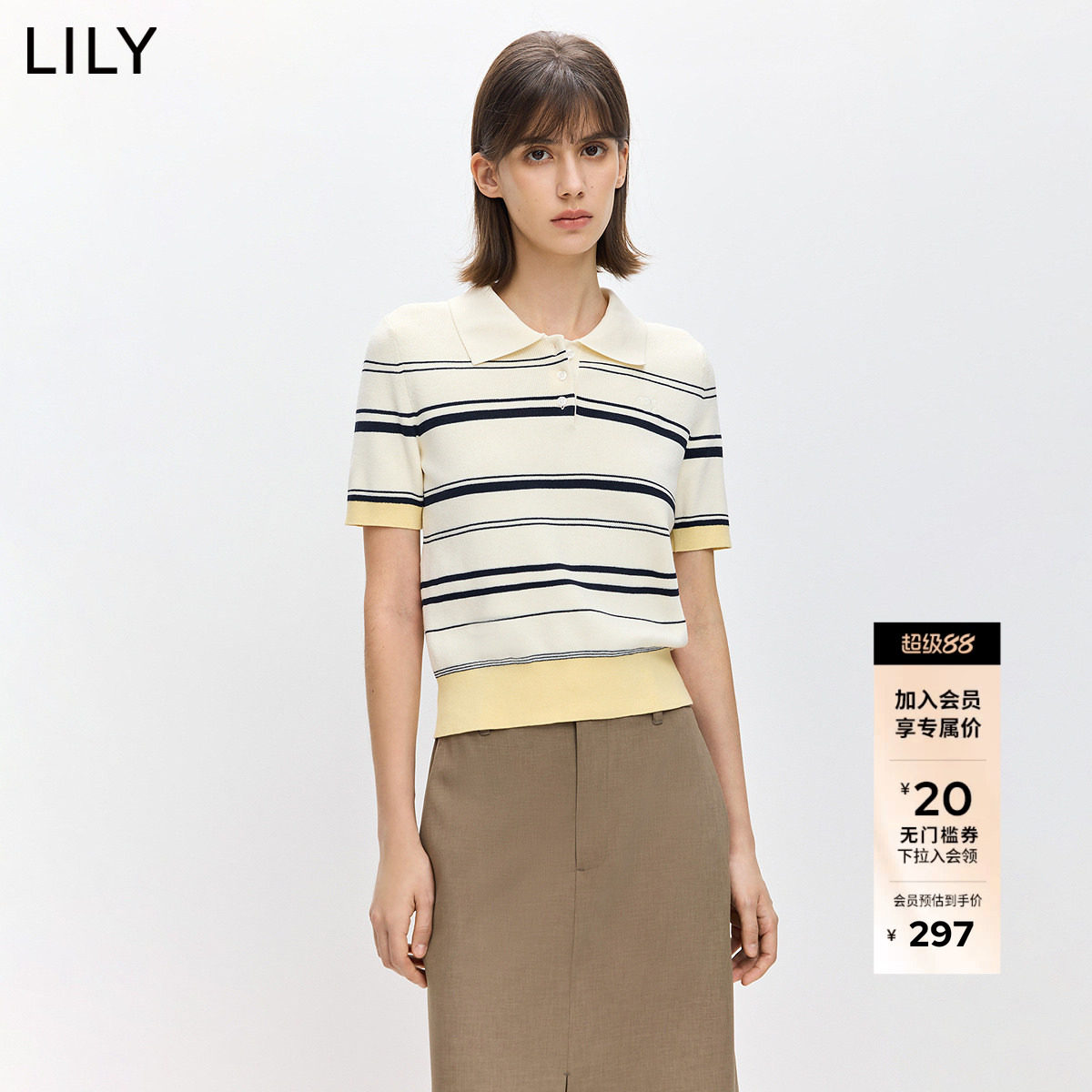 LILY2026春新款时髦简约POLO领撞色条纹休闲通勤短袖针织衫毛衣女