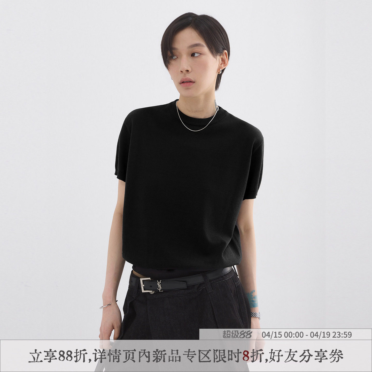 sameuoo散养文化「久仰」黑色亲肤冰丝针织衫短袖t恤女夏短款上衣