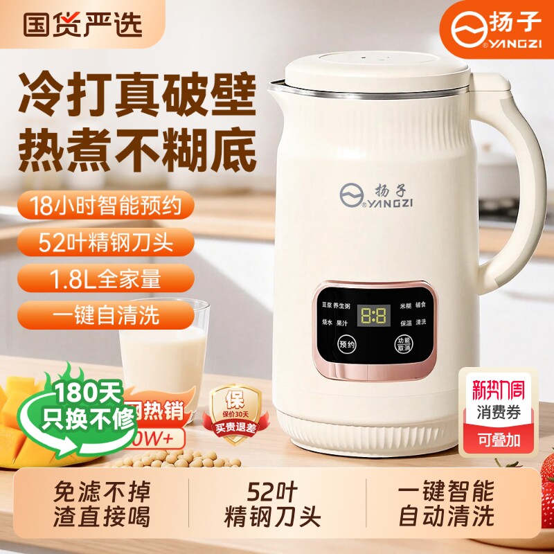 扬子破壁豆浆机家用静音小型大容量1.8L全自动免煮2026新五谷杂粮