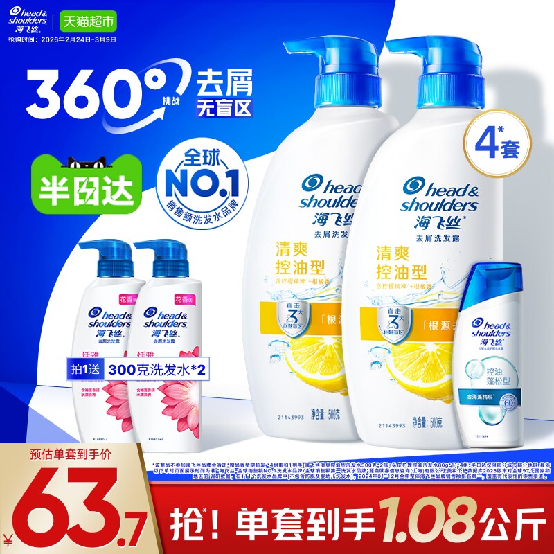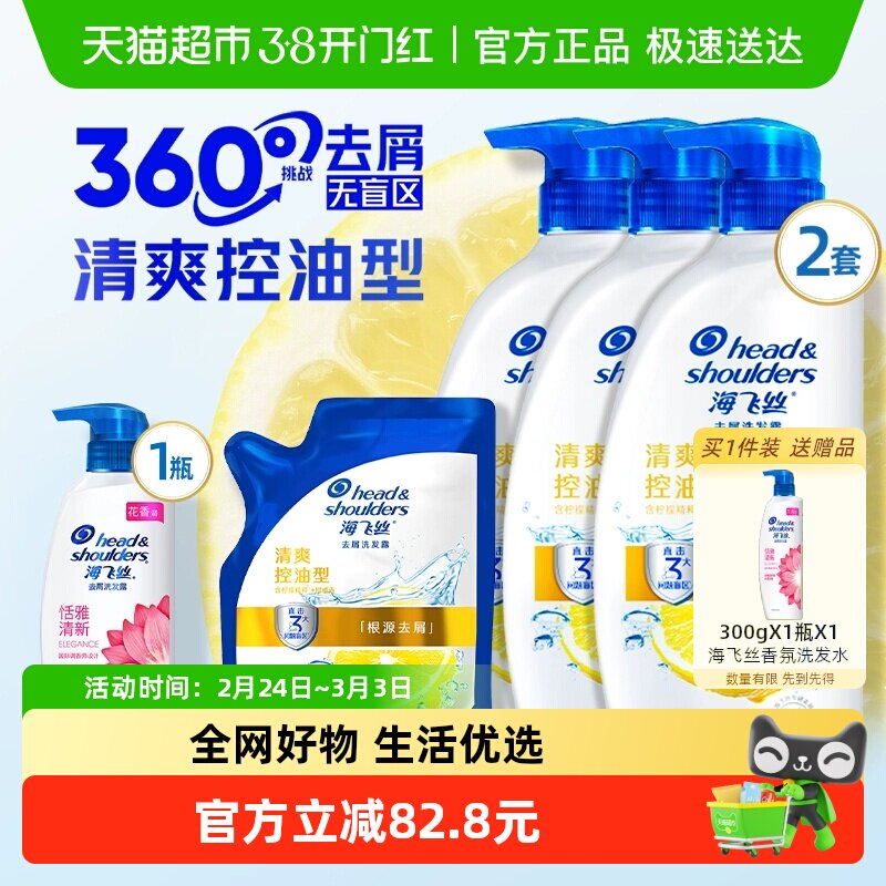 海飞丝柠檬清爽去油去屑洗发水套装(500g*3瓶+200g)*2套+300g