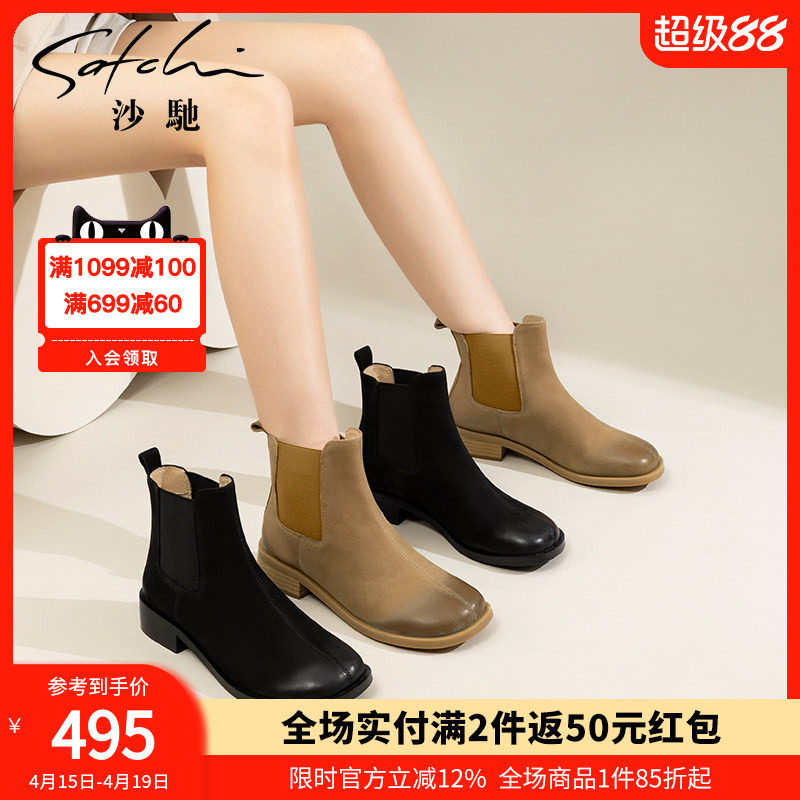 沙驰女鞋潮个性擦色切尔西靴女2025年秋冬季新款舒适粗跟圆头短靴