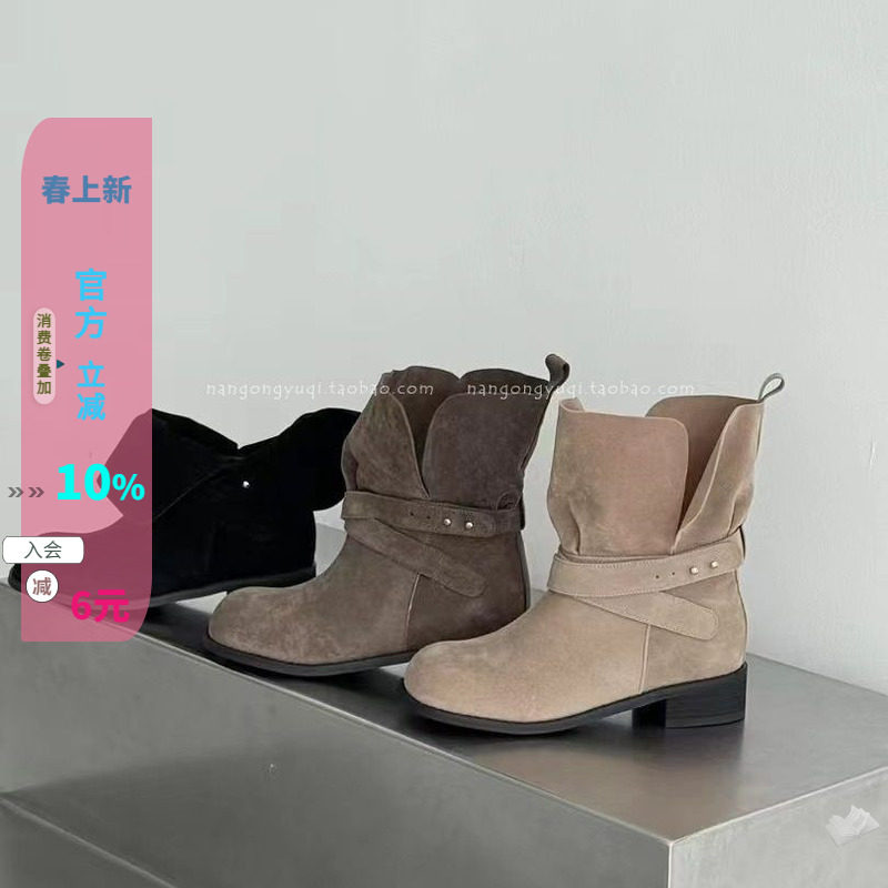 fed复古擦色牛反绒厚底皮带扣西部靴女秋冬新款中跟圆头宽筒短靴