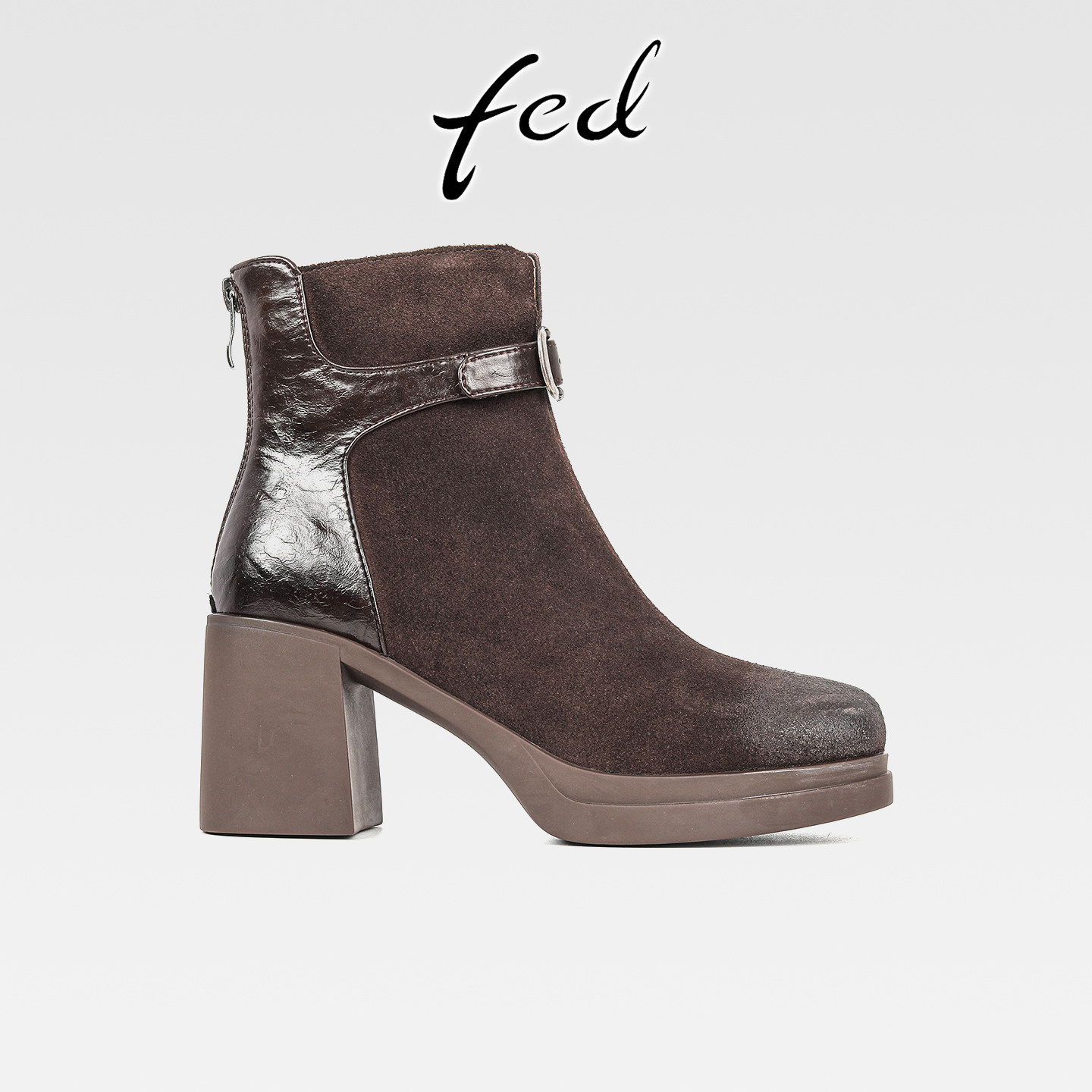 fed复古擦色牛反绒粗跟厚底瘦瘦靴女秋冬新款后拉链圆头高跟短靴