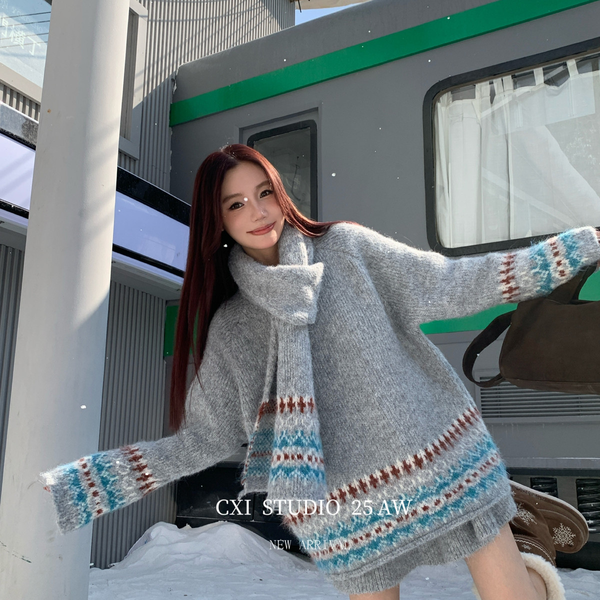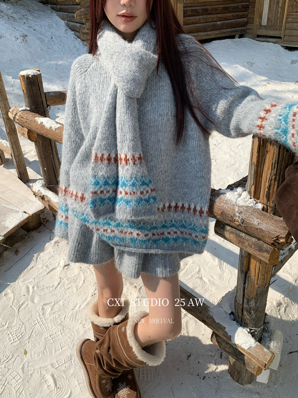 CXI-系费尔岛提花撞色加厚针织毛衣+百搭针织半身裙套装(配围巾)