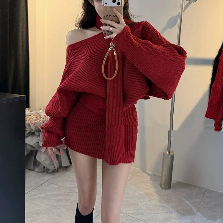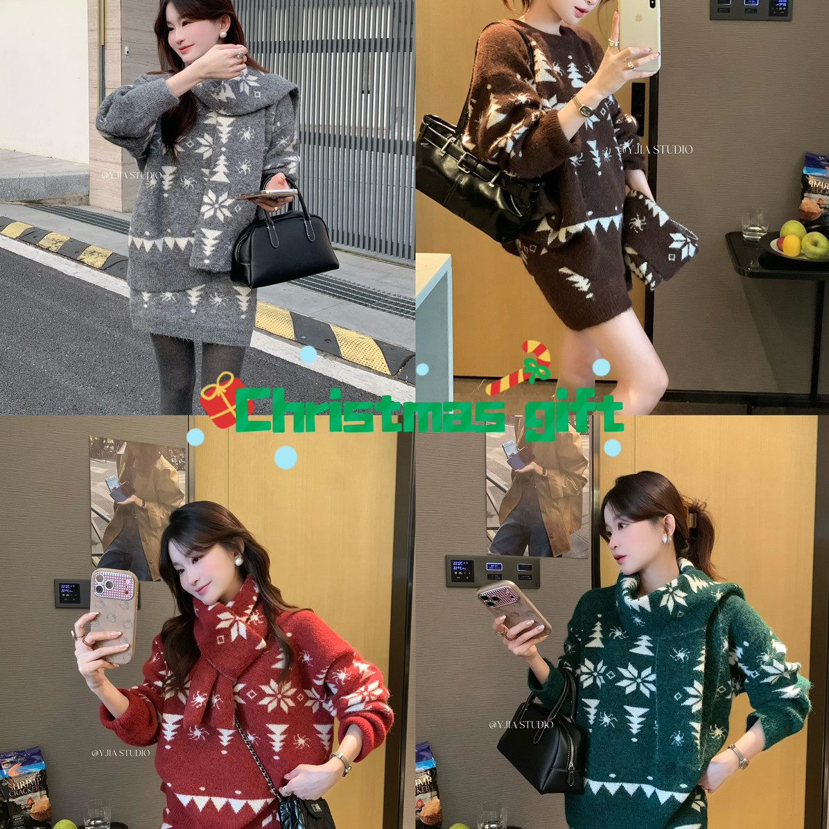 诺诺年圣诞露肩针织上衣毛衣+A字包臀半身裙套装(配围巾)A42428