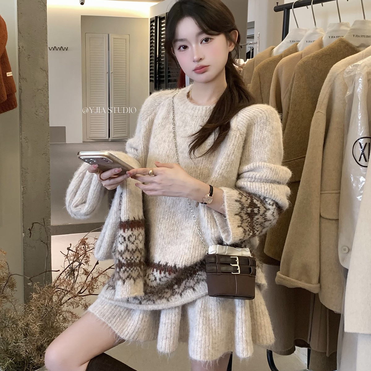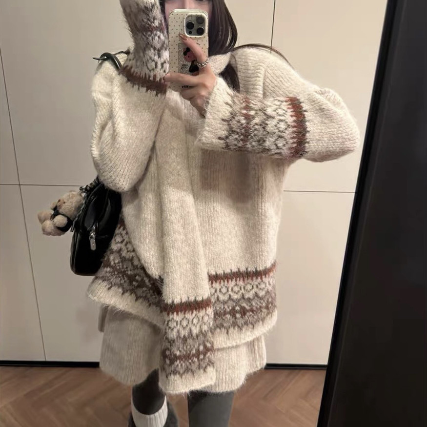 十三行正版2025冬季新款韩系费尔岛提花毛衣+半身裙套装(配围巾)