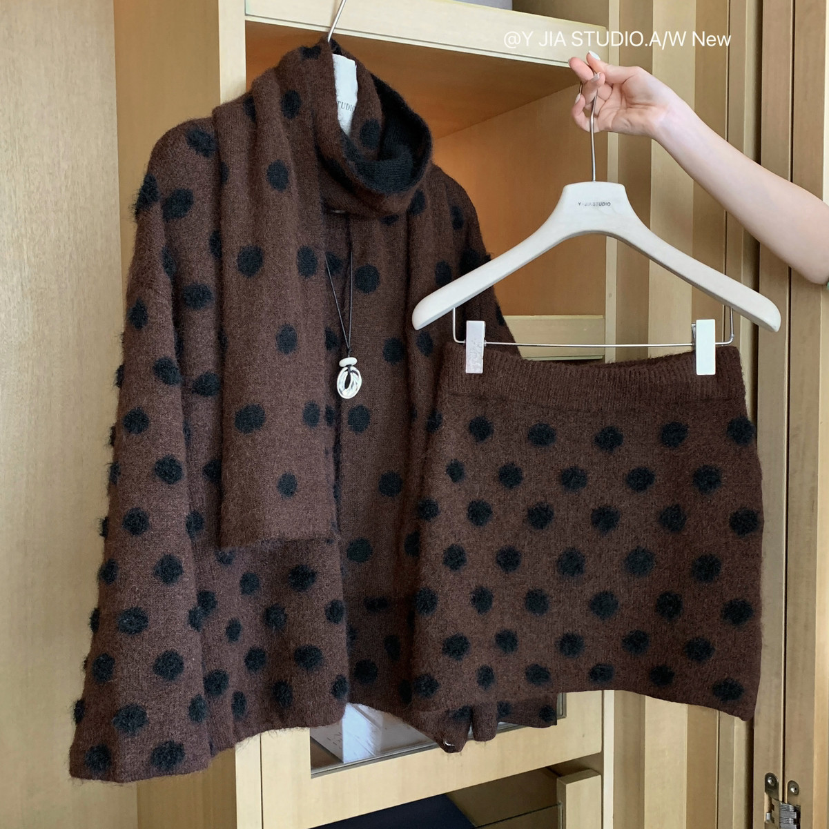 一善设计尔岛宽松圆领毛衣+短裙针织半身裙套装(配围巾)S-CW7599