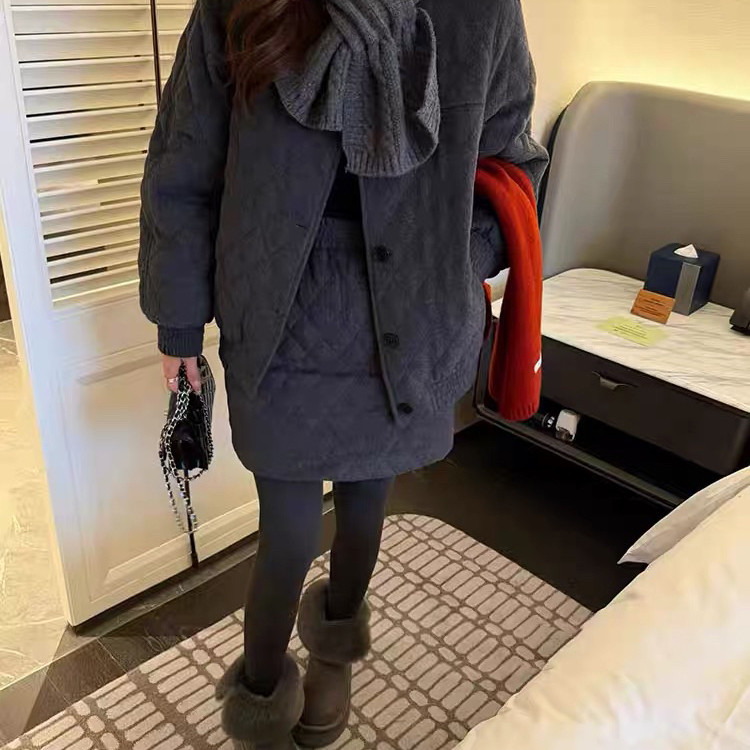 馨菲格加绒宽松短外套+松紧腰休闲百搭半身裙套装(配围巾)568247