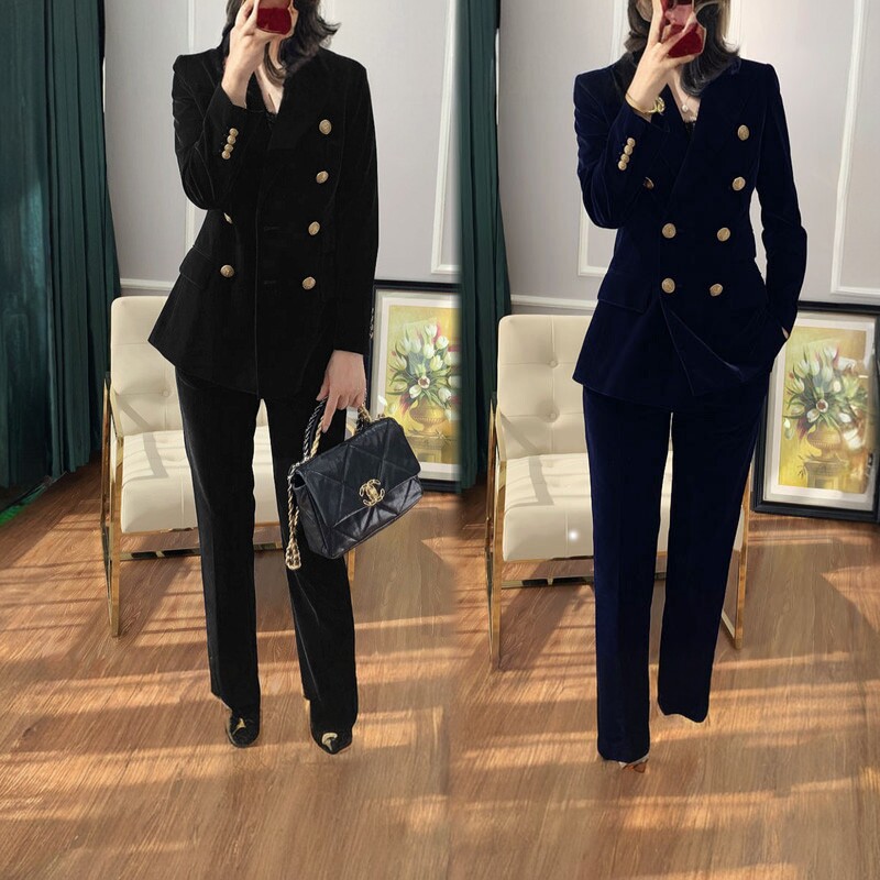 秋冬新款金丝绒西装套装女休闲时尚气质职业OL黑色西服长裤两件套