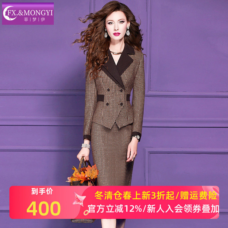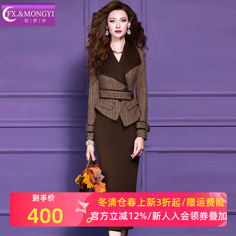 菲梦伊复古高级感时尚套装女冬季翻领收腰格子短外套职业半身裙子