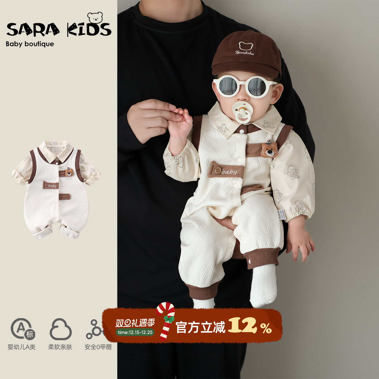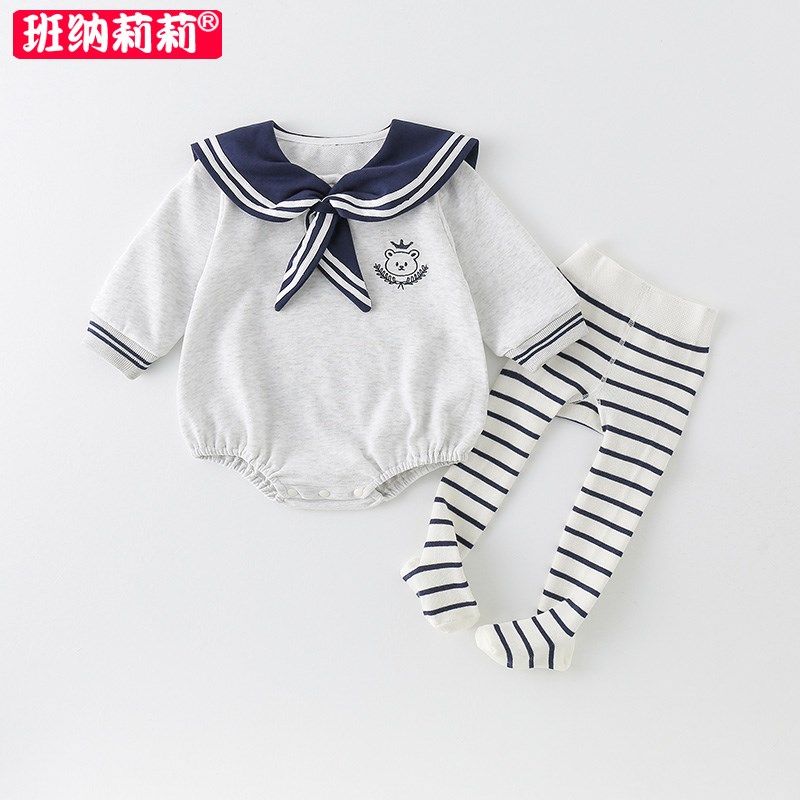 婴儿秋套装满月宝宝衣服春装新款百天周岁婴幼儿连体背带裤两件套