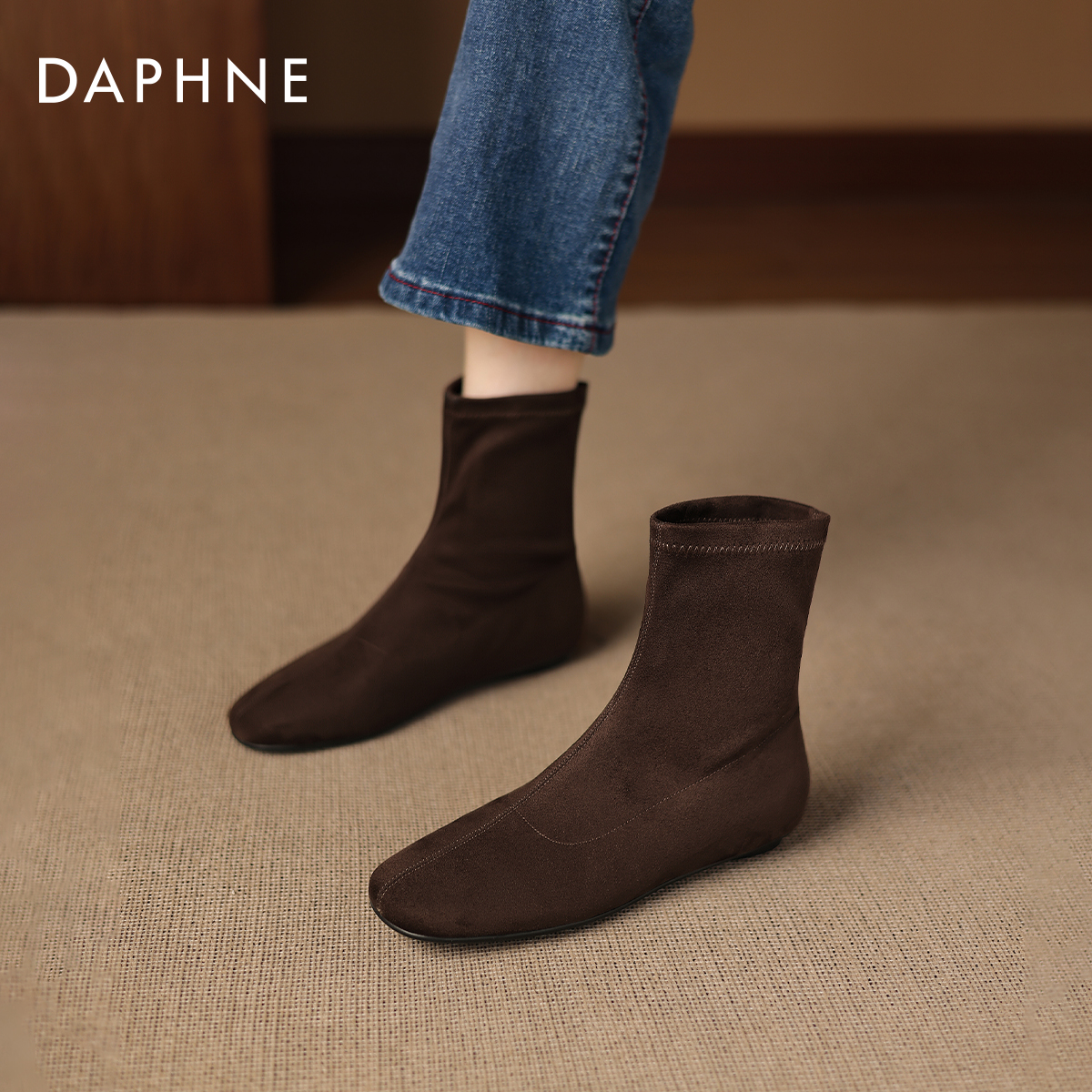 达芙妮平底瘦瘦小短靴2025新款秋冬棕色法式弹力袜靴女士马丁靴子