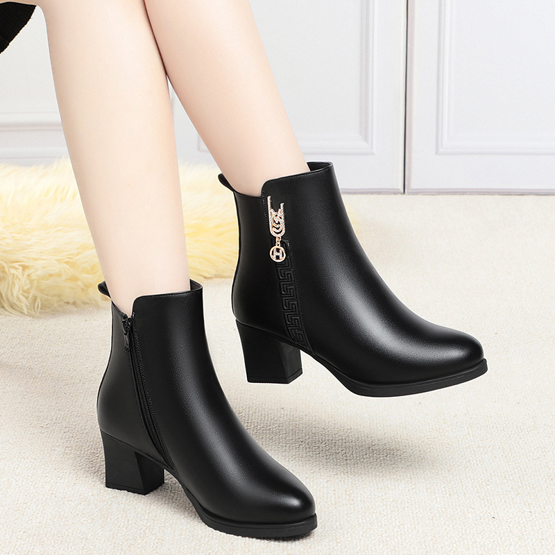 红蜻蜓妈妈靴子新款真皮加绒女靴鞋子中年女士粗跟短靴高跟马丁靴