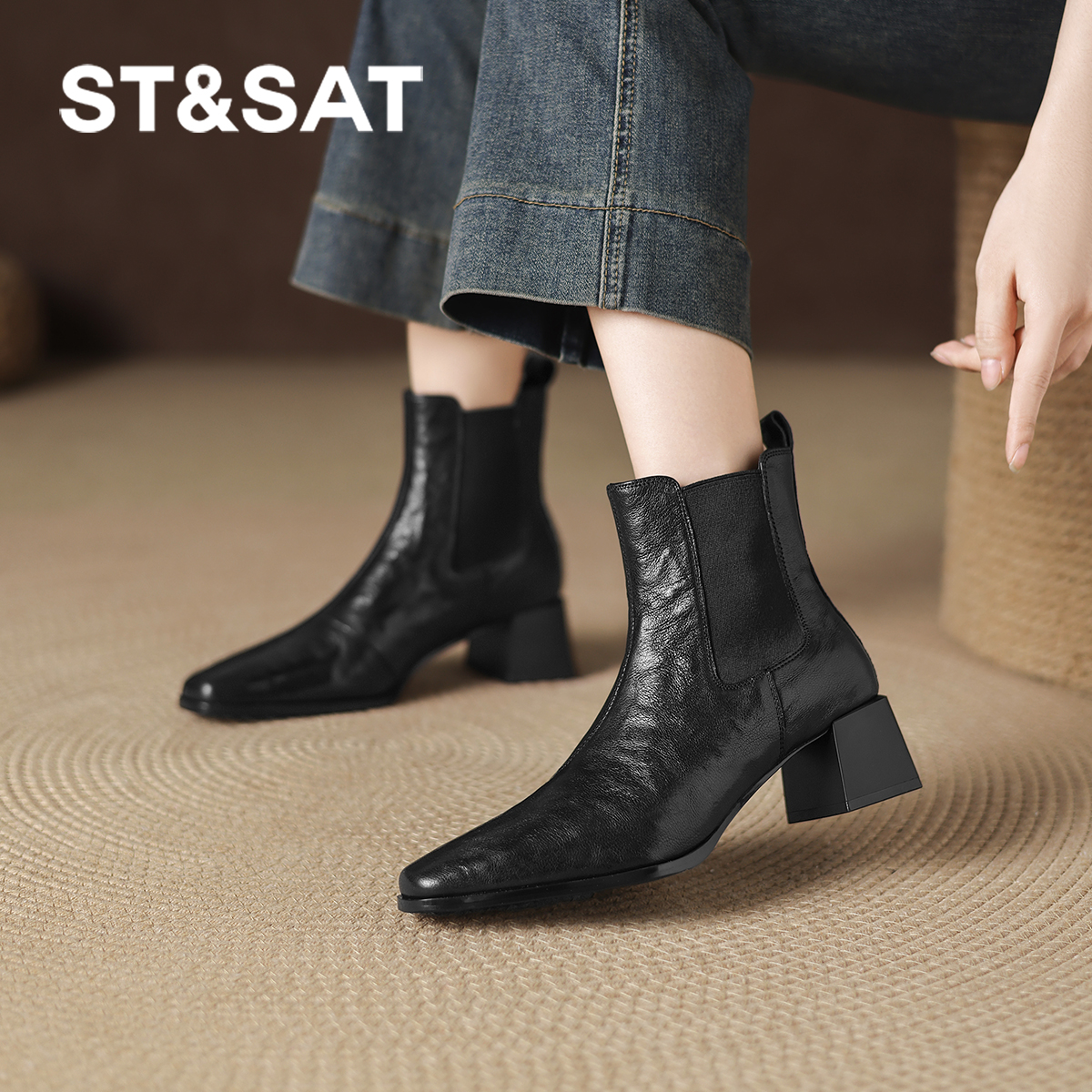 星期六高跟短靴女款2025新款秋冬皮靴子女士黑色瘦瘦靴百搭马丁靴