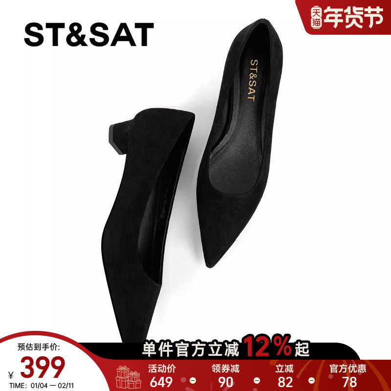 星期六黑色单鞋女2025真皮尖头浅口粗跟女鞋上班通勤不累脚工作鞋