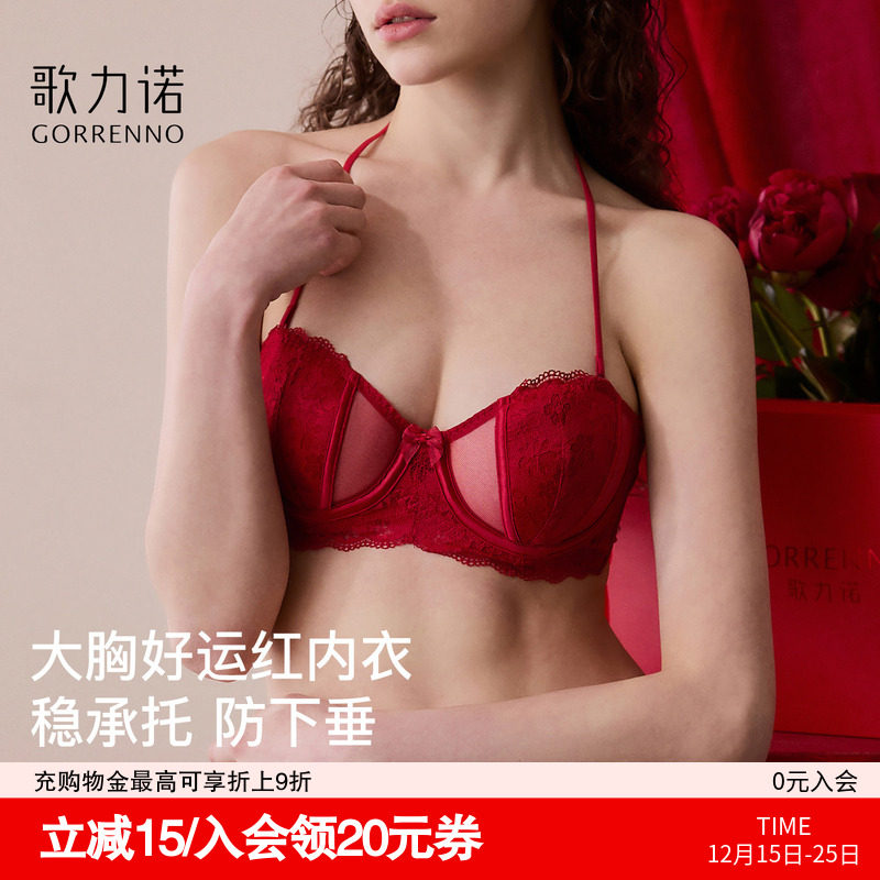 红色挂脖内衣女大胸显小无肩带抹胸聚拢半杯新娘结婚蕾丝文胸套装