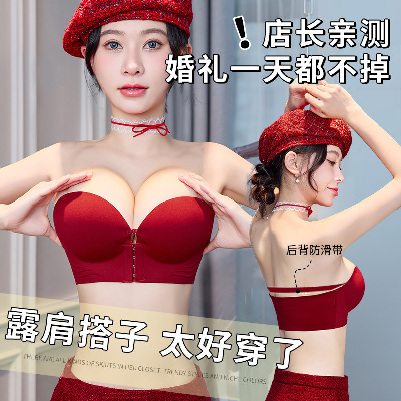 红色内衣本命年前扣无肩带文胸罩小胸聚拢显大防滑加厚结婚新娘用