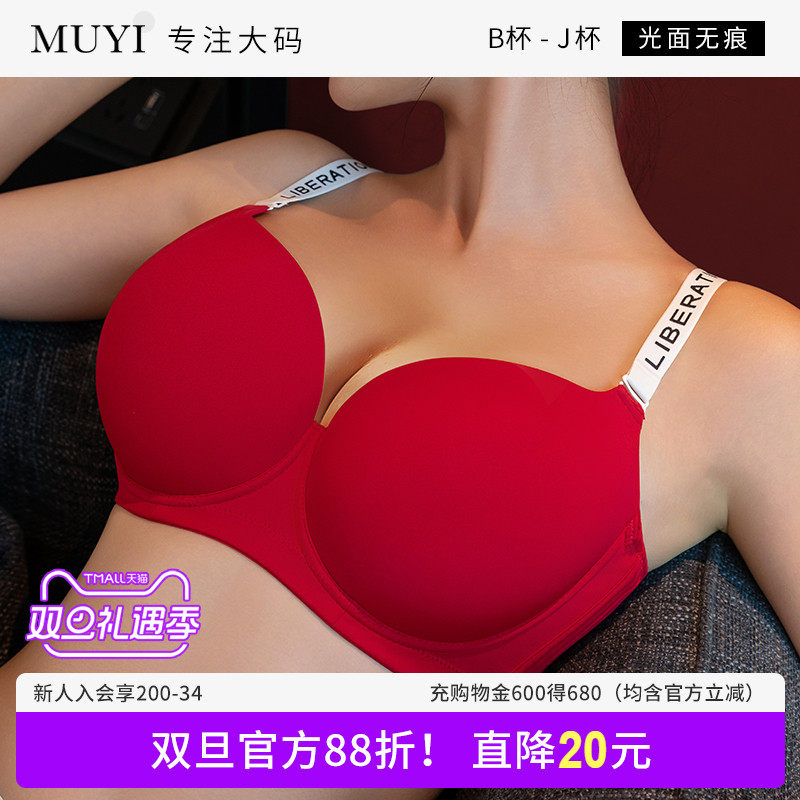 本命年红色内衣女小胸显大加厚无肩带无痕新娘结婚纱防下垂文胸罩