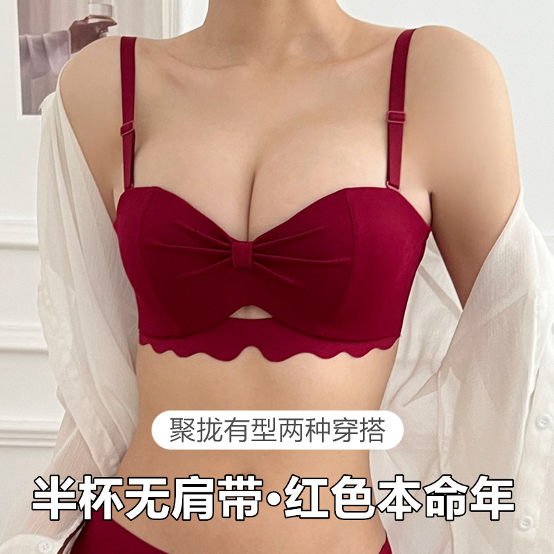 红色无肩带内衣女结婚新娘小胸聚拢显大防滑无钢圈本命年文胸马年