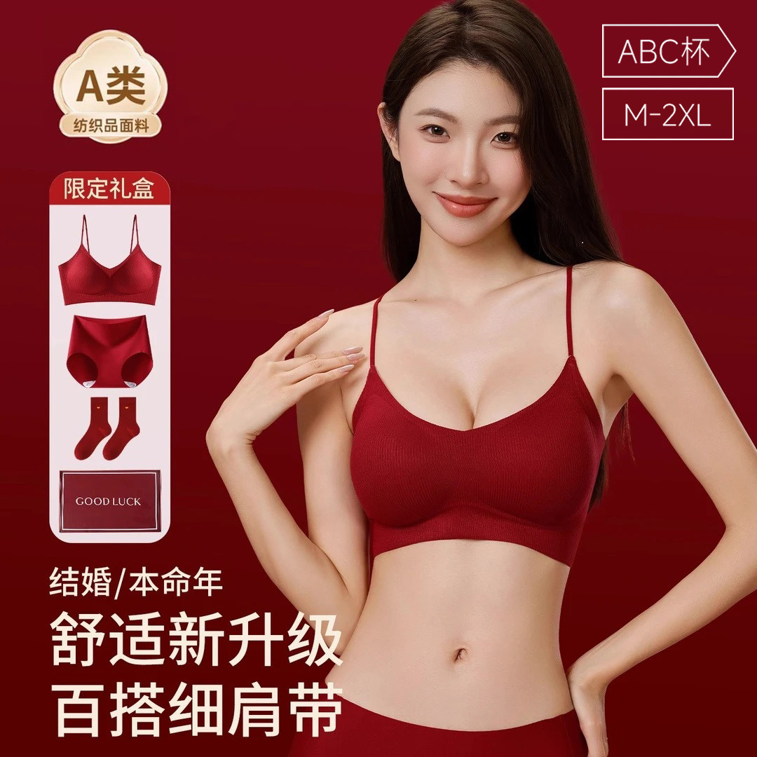 本命年红色细肩带文胸小胸聚拢收副乳防下垂新娘结婚无痕内衣套装