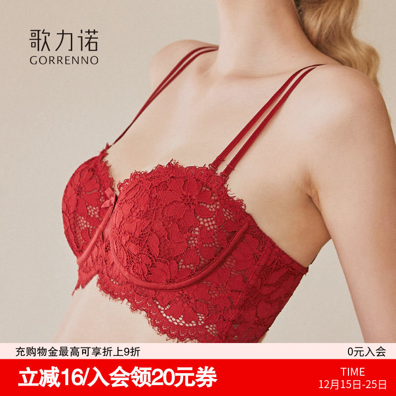 蕾丝红色性感抹胸无肩带内衣女小胸聚拢显大无钢圈结婚新娘文胸罩