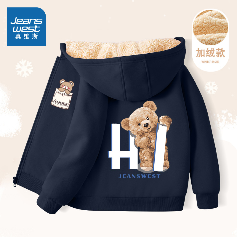 真维斯童装男童外套秋冬款男孩加绒加厚连帽开衫儿童冬季拉链卫衣