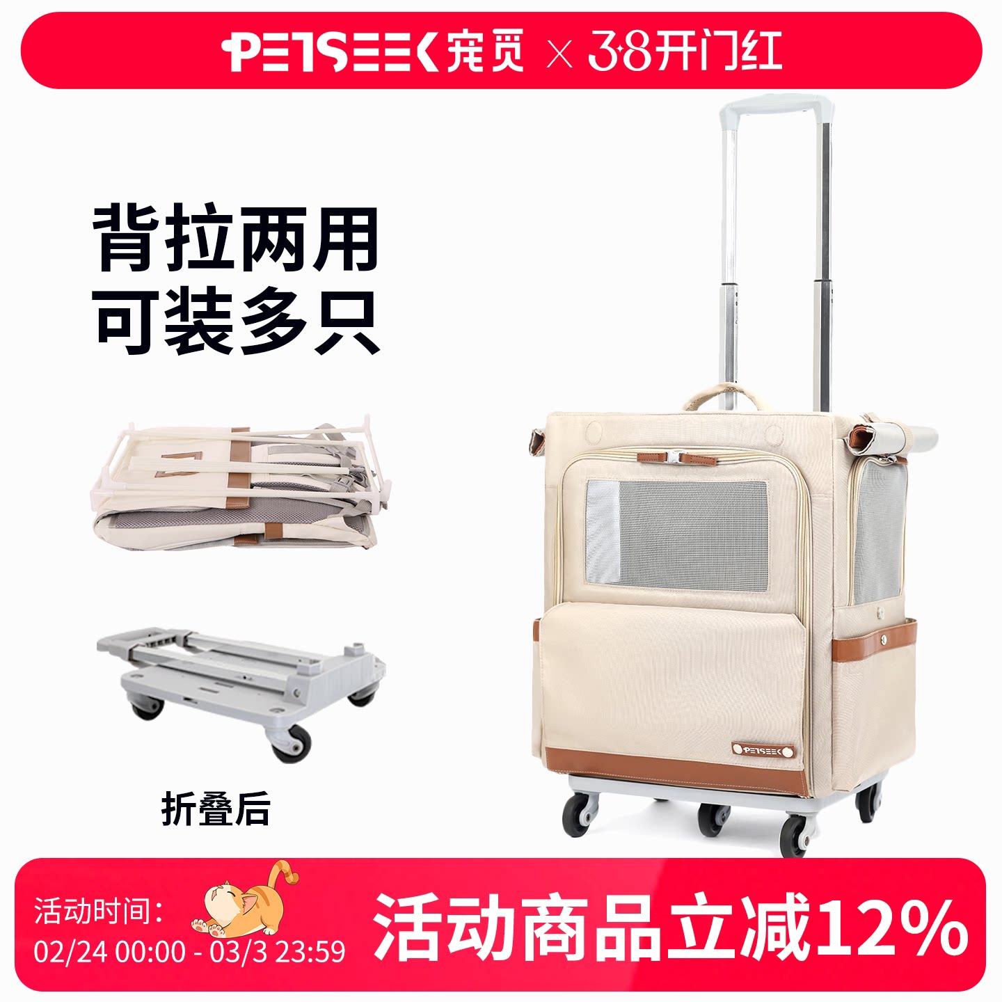 Petseek宠觅超大外出猫包便携狗狗猫咪透气车载宠物包拉杆双肩包