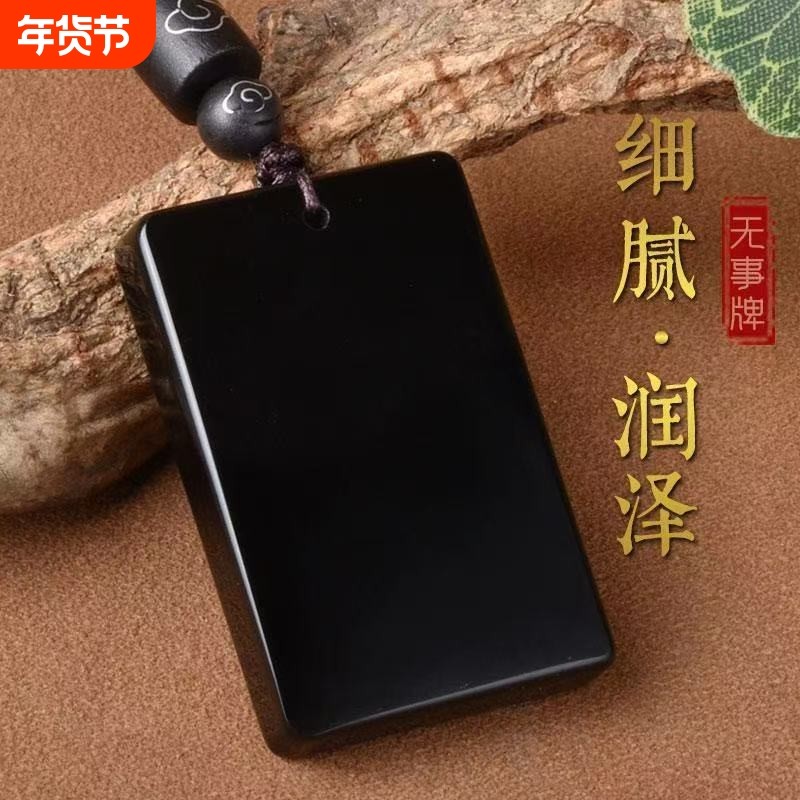 天然黑曜石平安无事牌吊坠男女本命年无字牌项链挂件饰品礼物冰种