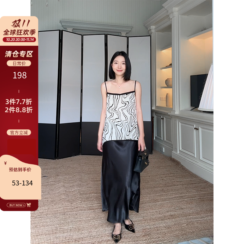 郭九九呢 100%亚麻拼接花边宽松t恤夏季百搭上衣缎面鱼尾半身裙