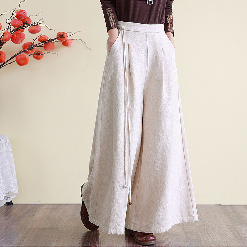 复古文艺亚麻棉宽松阔腿裤女春秋季休闲长款裤子提花刺绣宽腿裙裤
