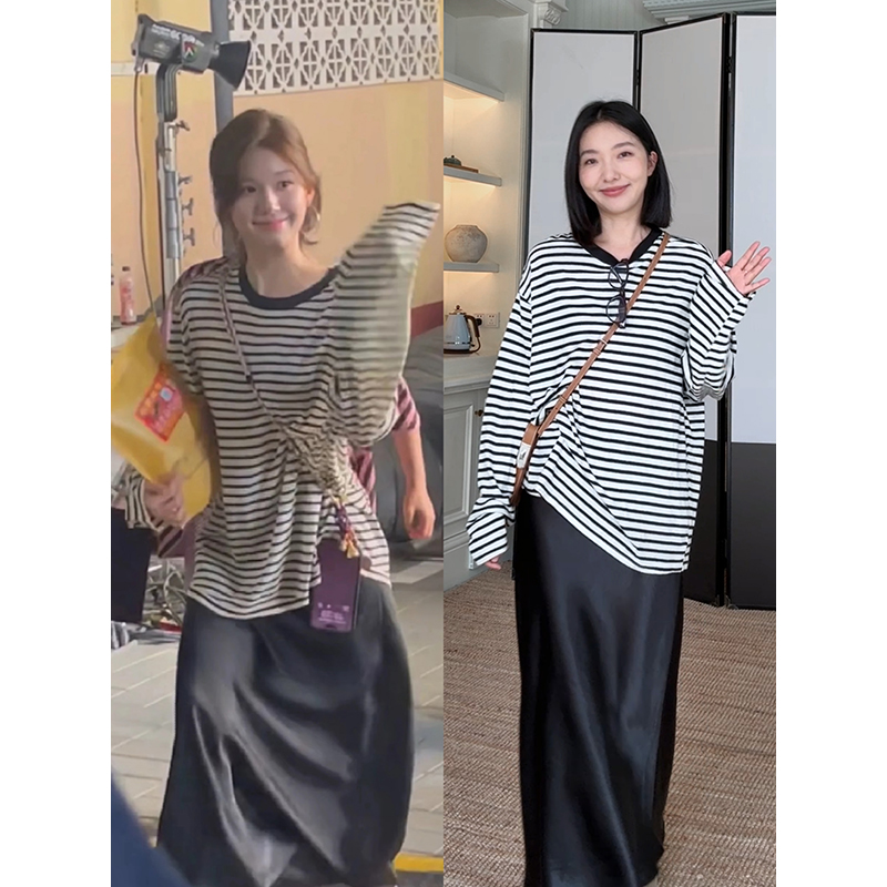 郭九九呢 亚麻棉宽松显瘦条纹长袖t恤早秋百搭上衣简约休闲半身裙