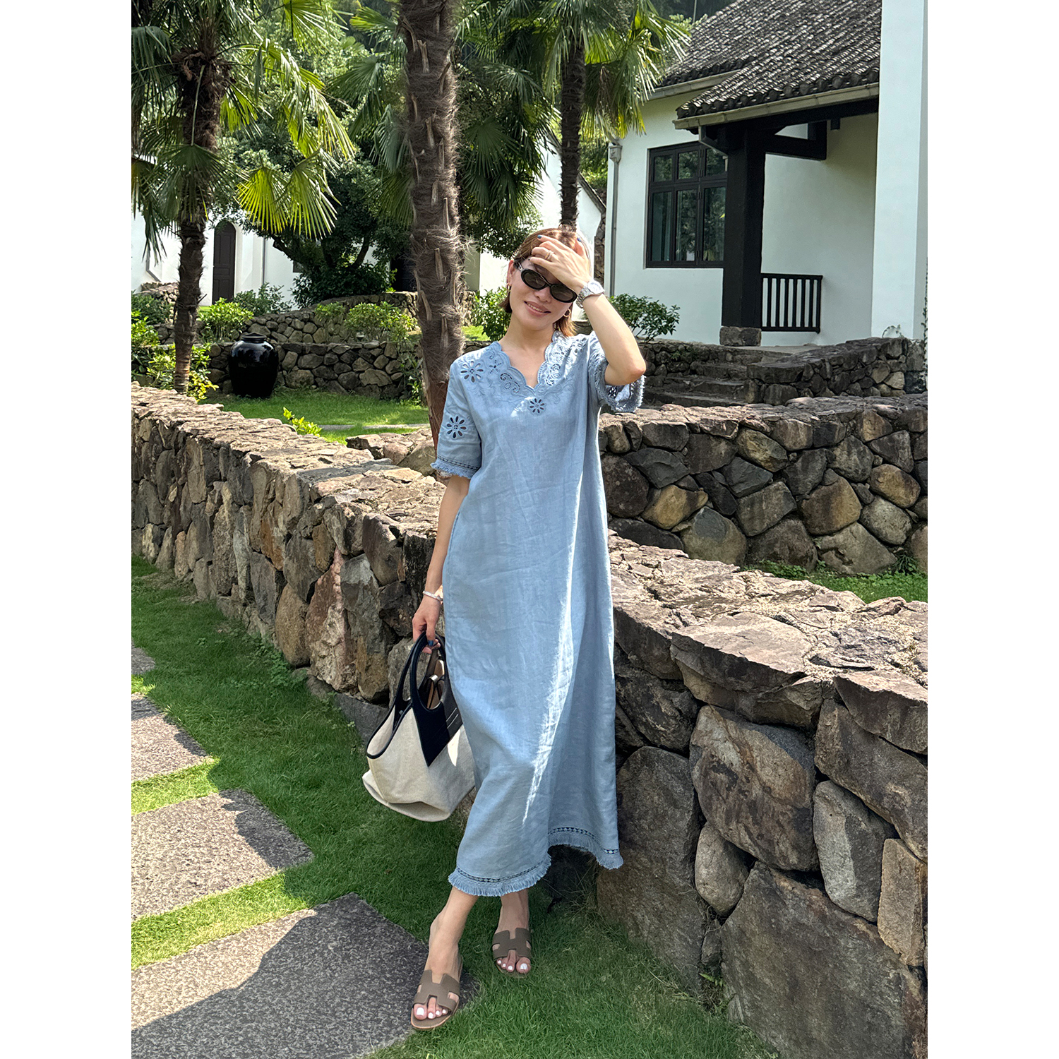 落落狷介 春季长袖连衣裙亚麻宽松V领小个子刺绣镂空裙子2025新款