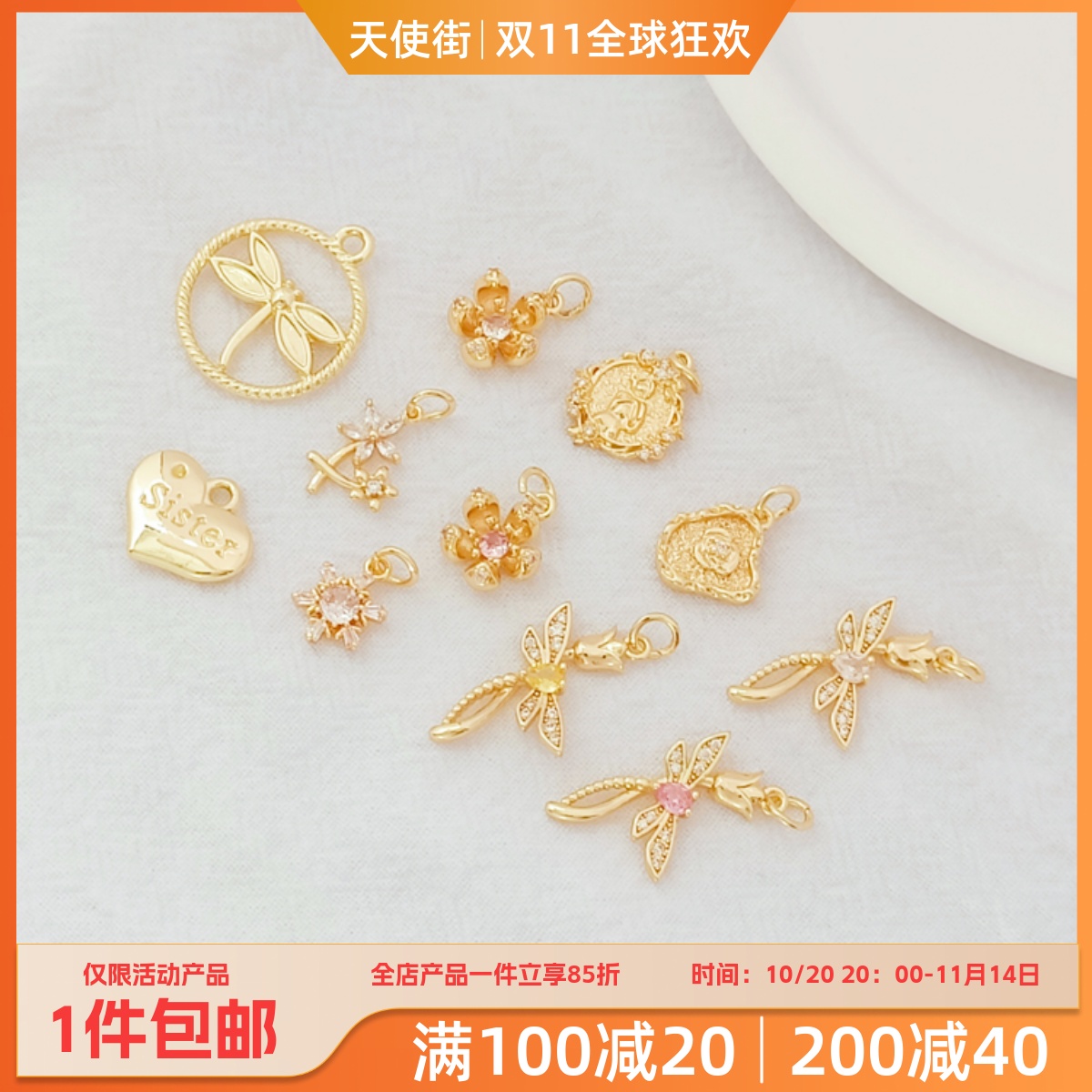 14K包金保色镶锆花蕊花心蜻蜓桃心不规则吊牌手工DIY手链项坠吊坠