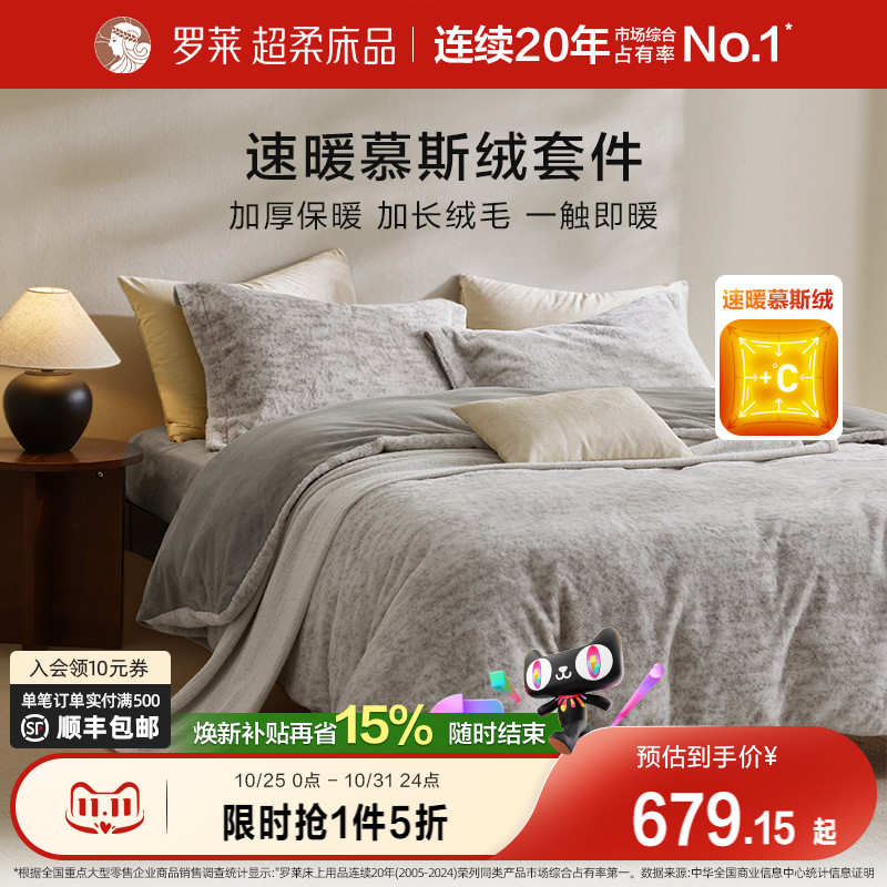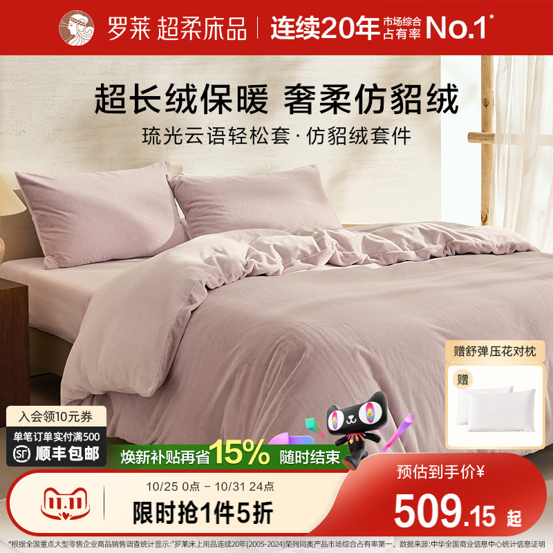 罗莱家纺25秋冬新品长毛绒慕斯绒双面暖绒加厚被套双人床四件套